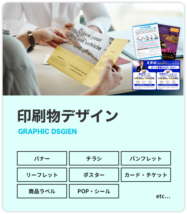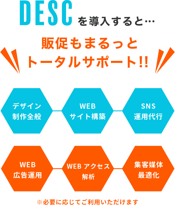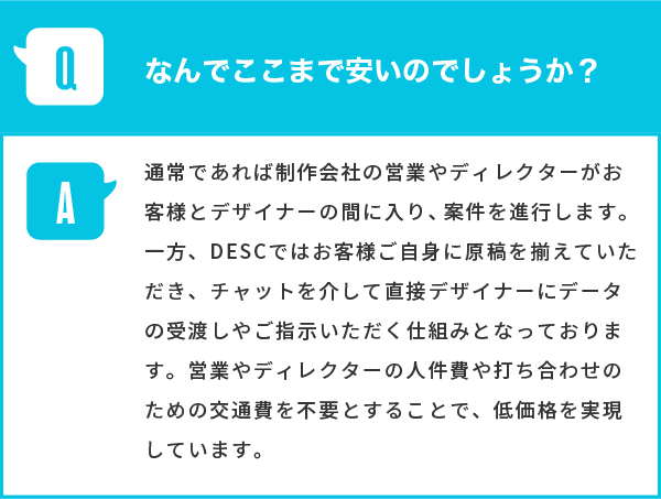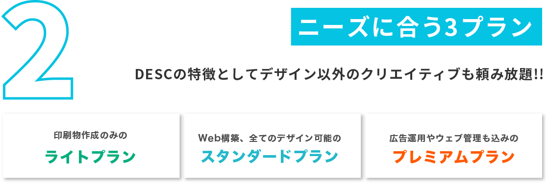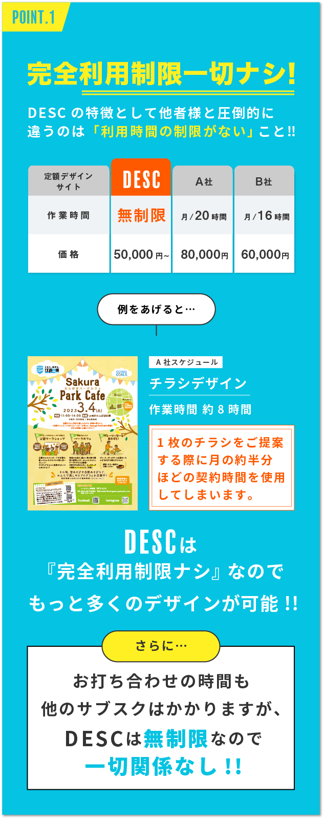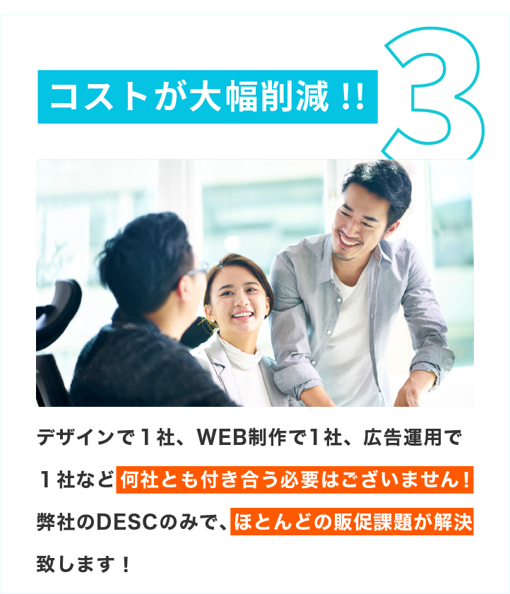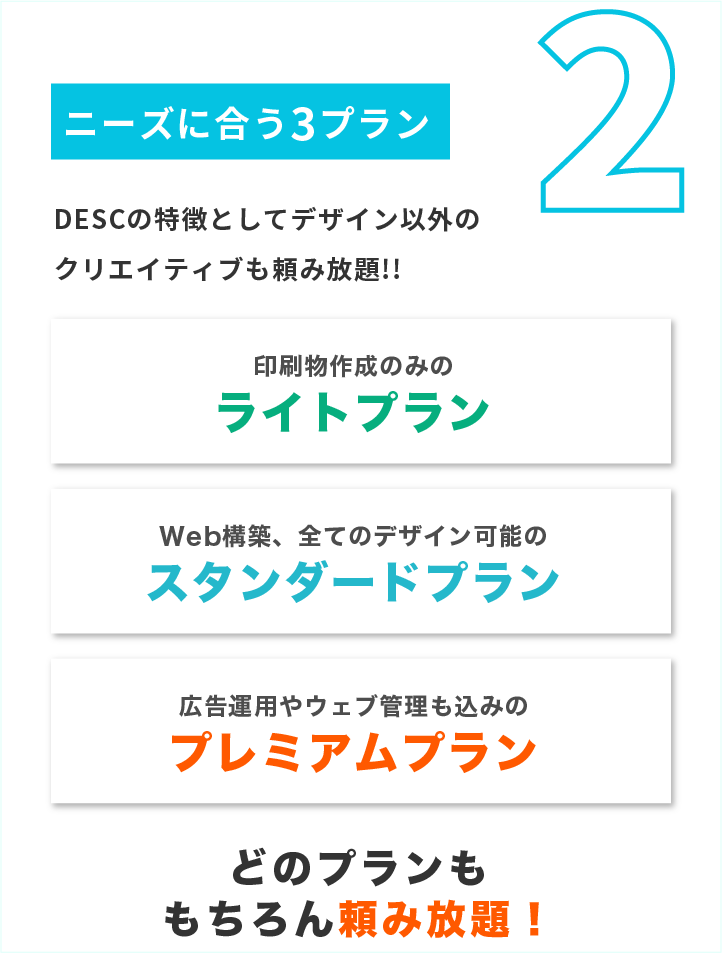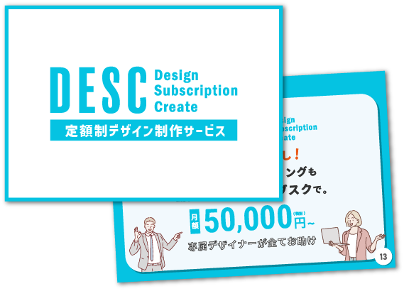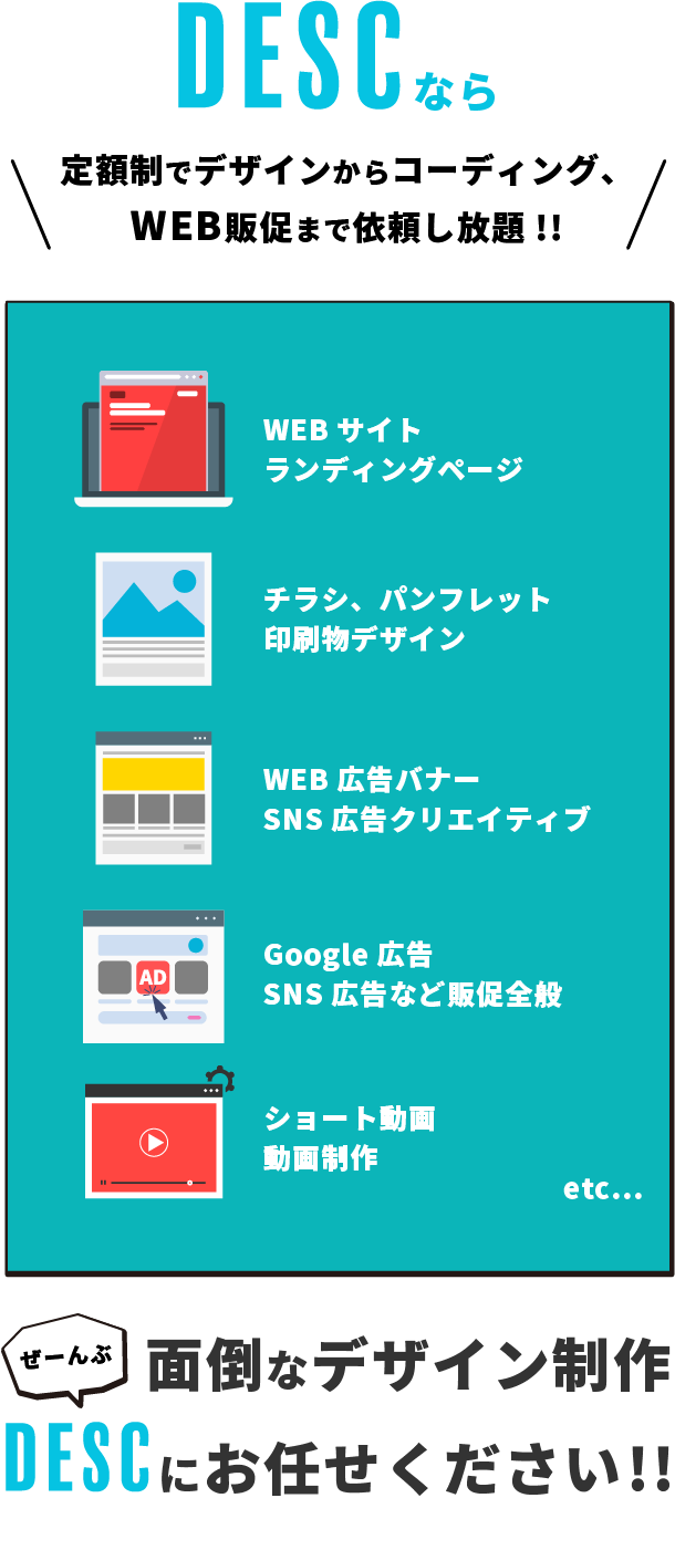こんなお悩み、 ありませんか? 全て解決できます!! DESCは WEB構築WEBデザイン、印刷物まですべての デザイン制作を定額料金で頼み放題で 依頼できるサービスです!! どのプランも もちろん頼み放題! 当サイトでは、様々なデザインが 可能となっています。 印刷物からWebデザイン、広告運用も可能に。 その中の一部をご紹介しております。 当サイトでは、印刷物のみの方、コーディングもお願い したい方、広告もweb全般全てお願いしたい方へ向けた プランをご用意しております。 よくあるご質問 こんなお悩み、 ありませんか? 全て解決できます!! DESCは WEB構築WEBデザイン、印刷物 まですべてのデザイン制作を 定額料金で頼み放題で依頼できる サービスです!! 当サイトでは、様々なデザインが 可能となっています。 印刷物からWebデザイン、広告運用も可能に。 その中の一部をご紹介しております。 当サイトでは、印刷物のみの方、コーディングもお願いしたい方、広告もweb全般全てお願いしたい方へ向けたプランをご用意しております。 よくあるご質問 まずはお気軽に無料 お問い合わせ‼︎ 必須お名前 必須メールアドレス 必須電話番号 お問い合わせ内容 スパムメール防止のため、こちらのボックスにチェックを入れてから送信してください。 まずはお気軽に無料 お問い合わせ‼︎ 必須お名前 必須メールアドレス 必須電話番号 お問い合わせ内容 スパムメール防止のため、こちらのボックスにチェックを入れてから送信してください。